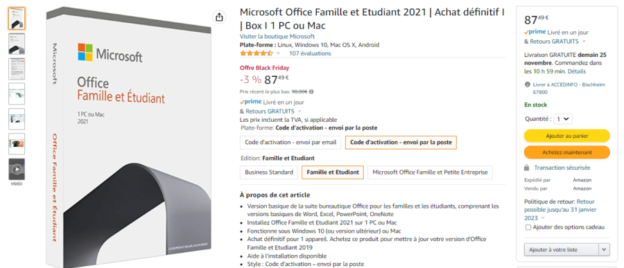 Dispo en promo back friday ce 24Nov, le pack office 2021 Famille est disponible a 88Eur.
